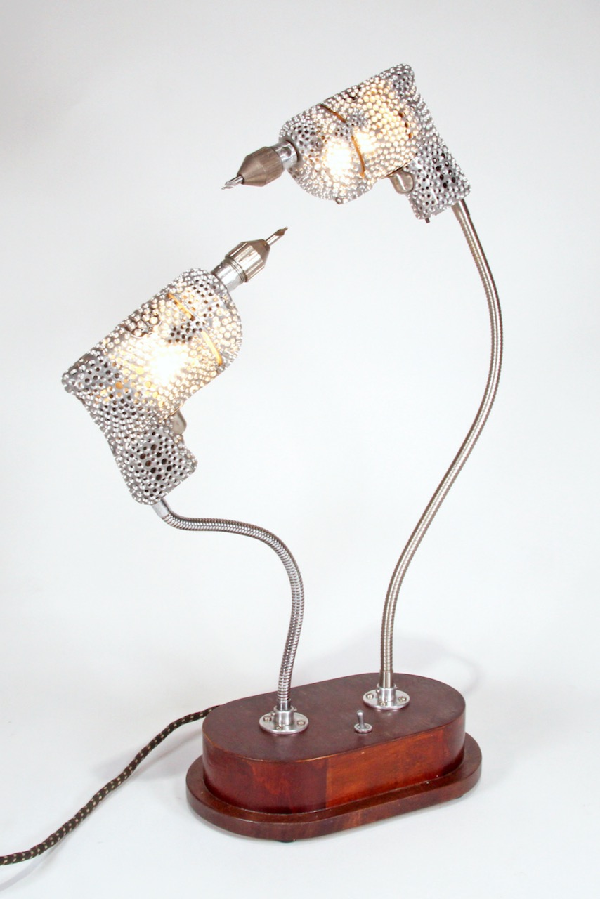 In the Third Street windows, two sculptures address labor and competition. The Grind (2021) features a prosthetic arm connected to a crank that, when activated by the viewer, reaches out to grasp a dollar bill dangling on a hook. Beside it, Bored to Death (2023) is composed of two power drills in battle, drilling each other nearly out of existence. Light glows through their hole-riddled bodies, creating a dazzling disco effect at night. These sculptures imply a sense of helplessness, an inevitable lack of control, where the guns in the Harrison Street windows are more focused on solutions and actions. But both perspectives encourage the viewer to envision new approaches to these complicated topics. How can we take action without relying on tools that distance us from the unsavory details? Or can we build new tools that don’t simply follow the methods of old ones?