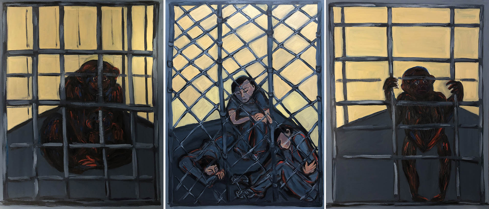 In the triptych titled Facility, three young boys sit on the floor of a chain-linked cage, looking despondent and cold. Their black garments almost blend in with the floor, making them hard to see despite the brightness of the yellow background. In the right and left panels, monkeys in cages engage with the viewer. One appears to be an adult with a baby, and the other – possibly a youth – stands with his hands on the bars of the cage. All of the figures in this triptych have been removed from their original contexts, victims of a system beyond their control. Seeing them from the other side of the cage, we as viewers become participants, though it is left up to us to decide whether our role is as witness, voyeur, or imprisoner.