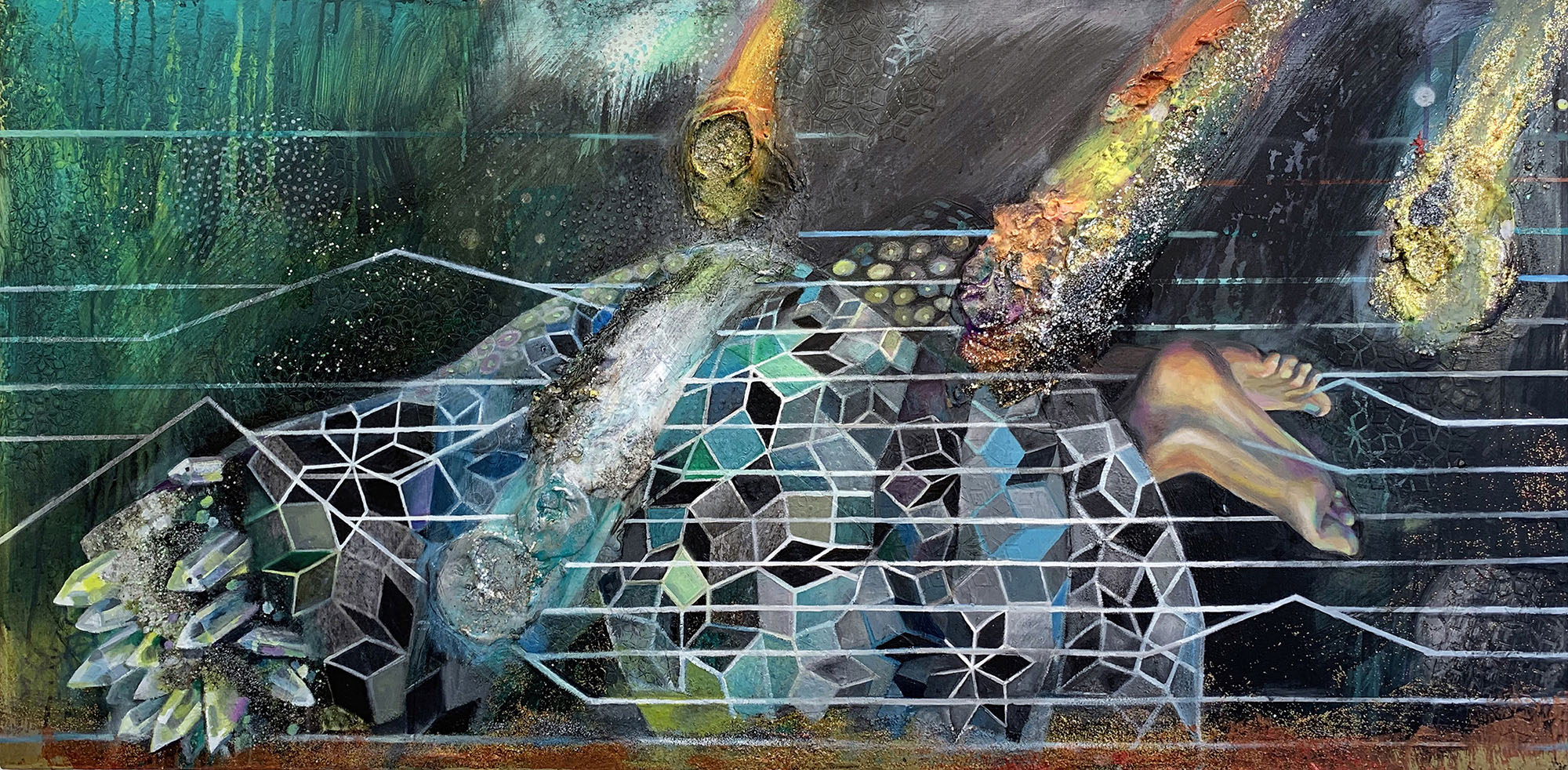 In the Third Street windows, five paintings depict old-fashioned microphones and Nikola Tesla’s Wardenclyffe Tower. The forking rays extending from these objects could be interpreted as sound or energy, but their patterning is also similar to mycorrhizal networks, bringing to mind the deeper connections and unseen forces that support and influence our daily lives. Quinacridone Succulent (2022) depicts a woman emerging from the center of a succulent plant, masking her face with large tropical flowers. Poethig uses the algorithmic patterns of nature as a way of linking the body to the larger systems of life on Earth.