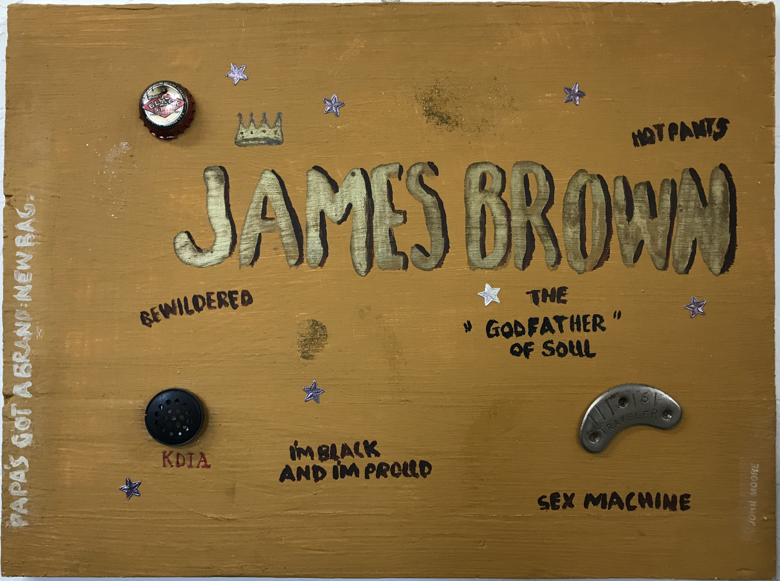 Moore’s reverence for music and musicians is broadcast throughout his work. Names like James Brown and Richard Penniman (also known as Little Richard) are featured in paintings, as well as lyrics from beloved songs, such as Stevie Wonder’s “Superstition.” But moreover, Moore’s work captures the spirit of the music through color, composition, and applied mixed media objects. In combination with other artworks on the walls of his home, they create a conversation about American culture and its many facets. We are privy to a visual mixtape of favorite songs and artists.